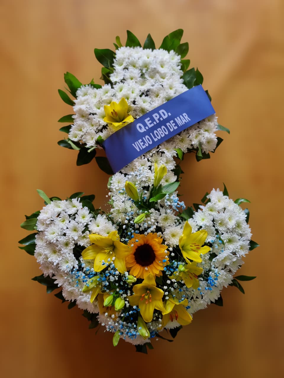 Corona en forma de ancla, 80cm x 60cm, con girasol, lilium y crisantemos, incluye cinta.