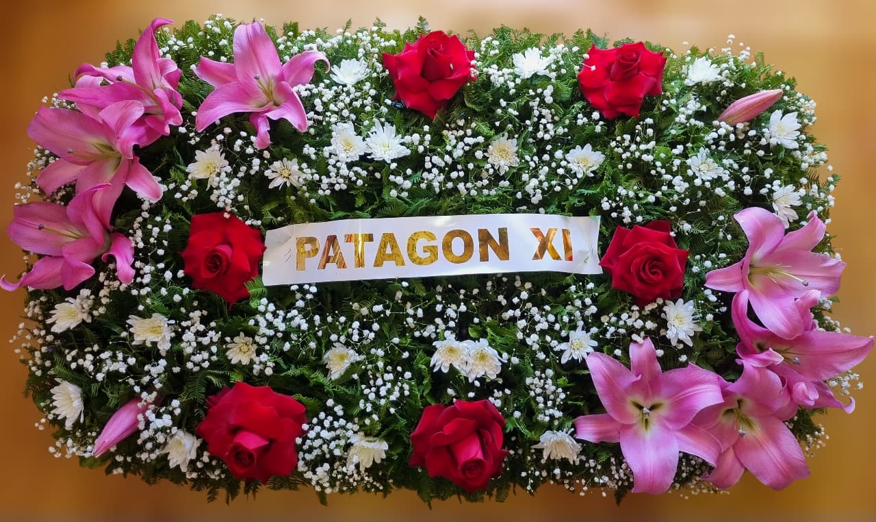 Corona rectangular 100cm x 60cm. Tiene 6 rosas, 6 lilium y crisantemos, incluye cinta personalizada.