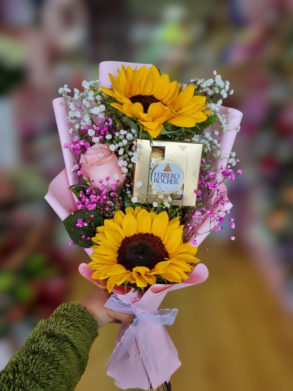 Ramo con 2 girasoles, una rosa y bombones ferrero rocher.
